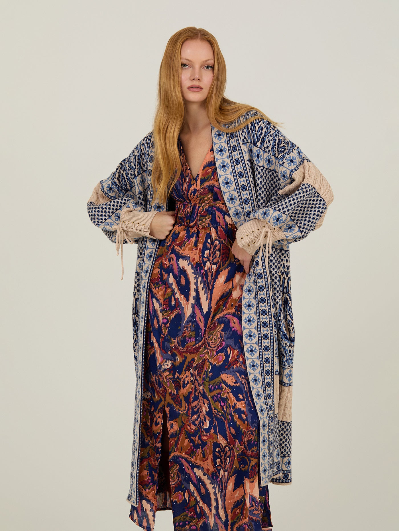 Abrigo de punto diseñado para aportar estilo, carácter y calidez a los looks de temporada. Su tejido jacquard presenta un estampado efecto patchwork con motivos étnicos, creando una propuesta visual rica y sofisticada que convierte esta prenda en una pieza protagonista.