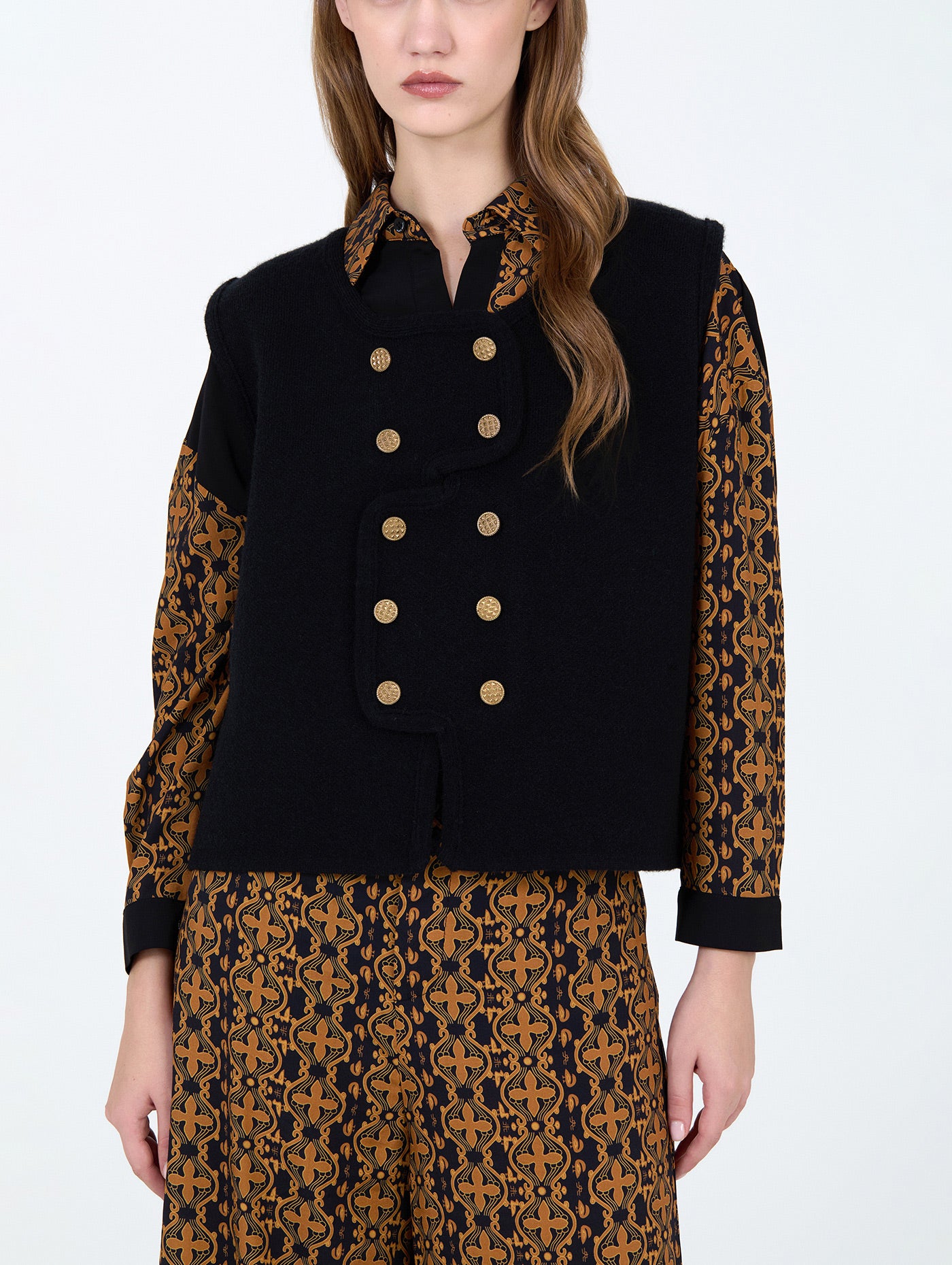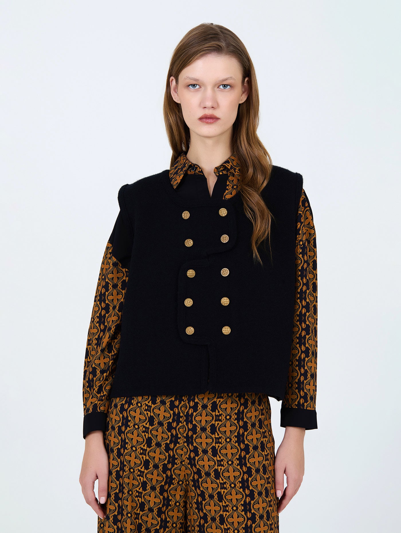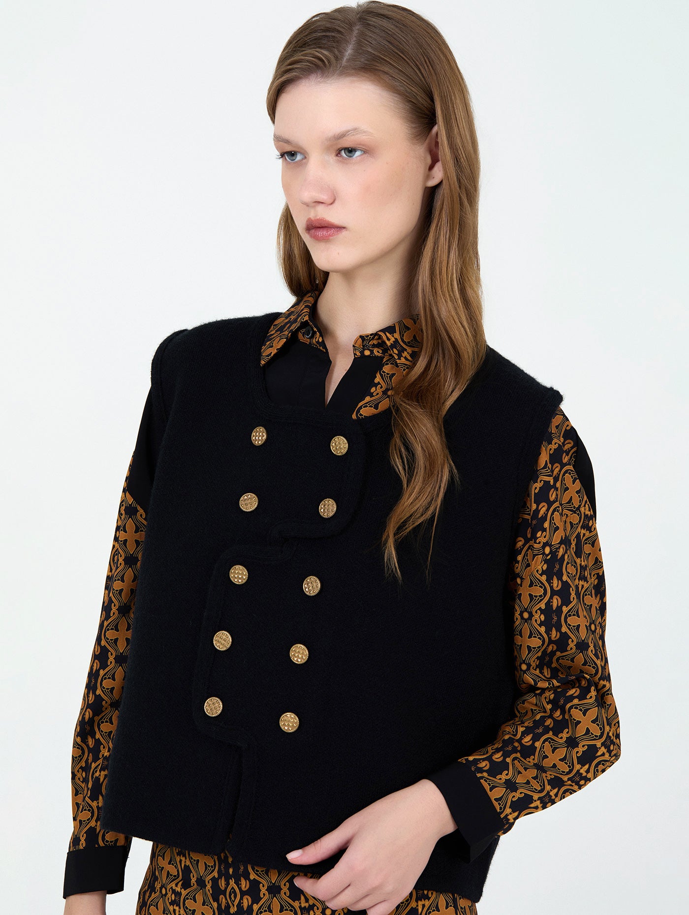 Presenta un cuello redondo clásico que enmarca suavemente el escote y un detalle de tapeta cruzada con ondas que aporta un aire romántico y distintivo. Los botones decorativos en tono oro viejo completan el diseño, dando un acabado sofisticado y elegante sin perder su carácter actual.