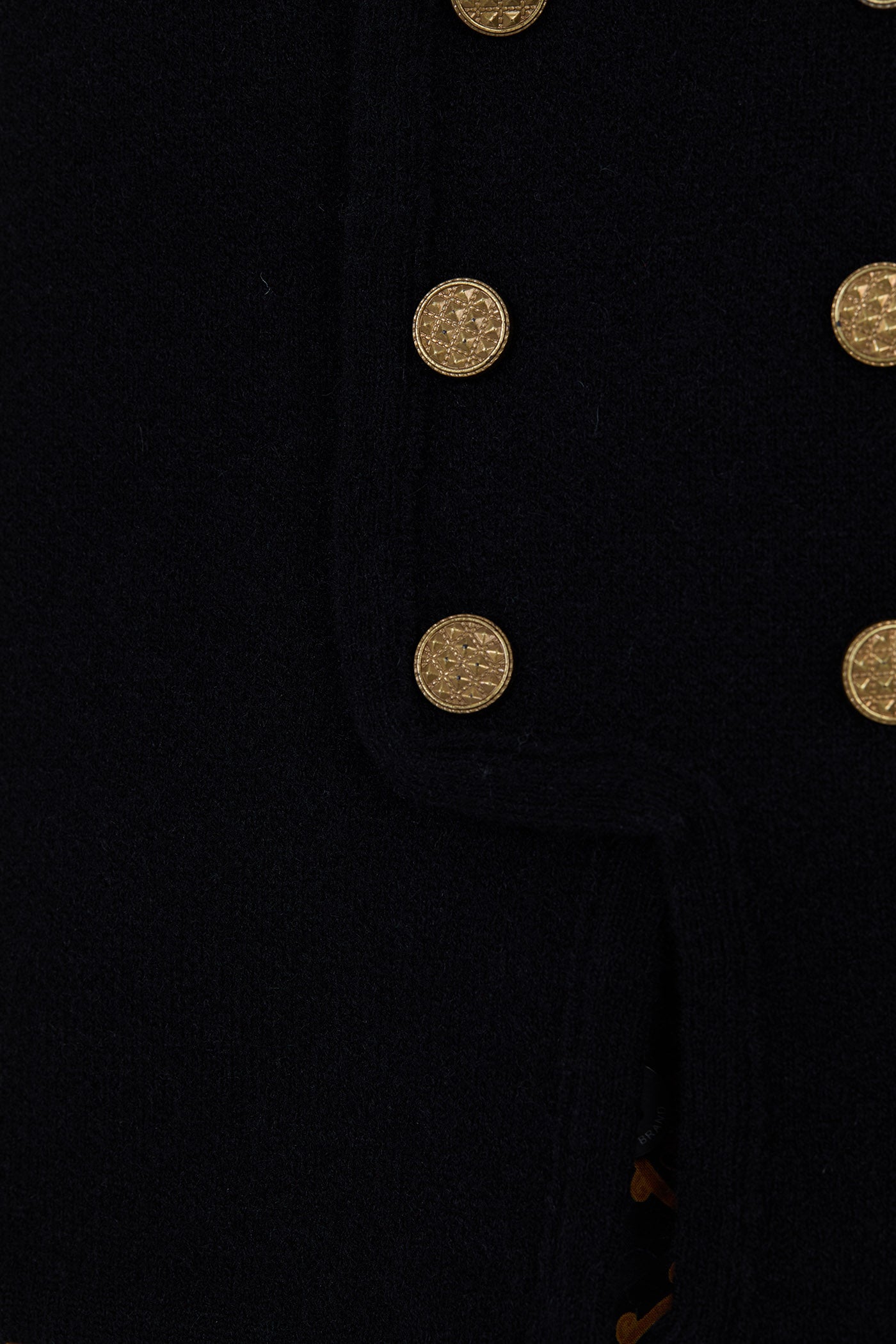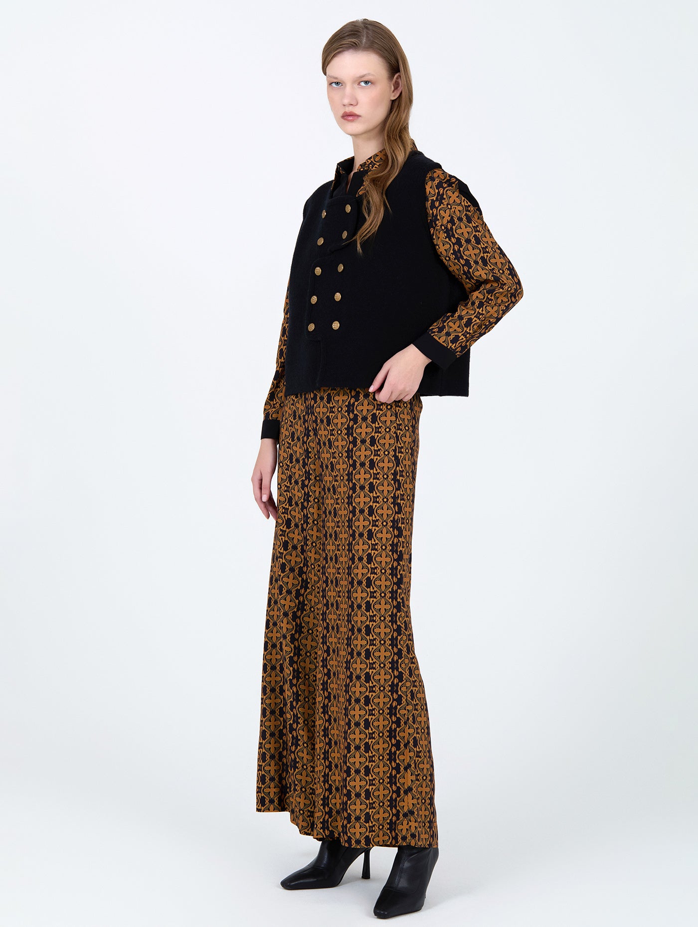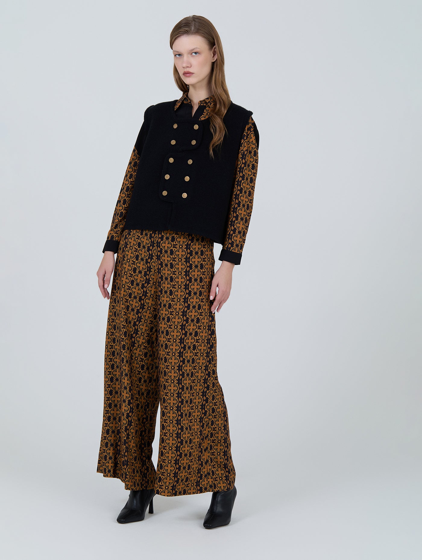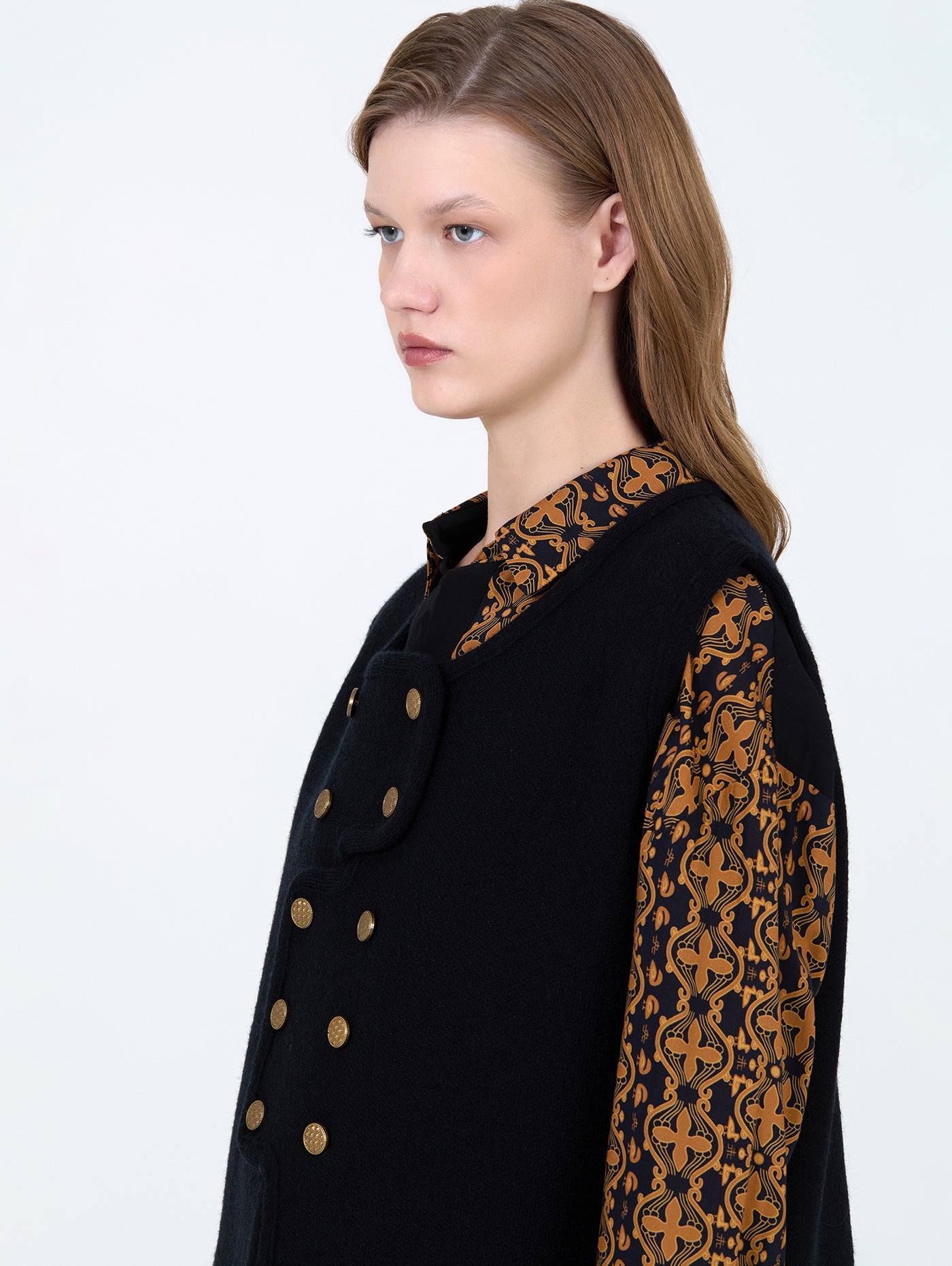 Presenta un cuello redondo clásico que enmarca suavemente el escote y un detalle de tapeta cruzada con ondas que aporta un aire romántico y distintivo. Los botones decorativos en tono oro viejo completan el diseño, dando un acabado sofisticado y elegante sin perder su carácter actual.