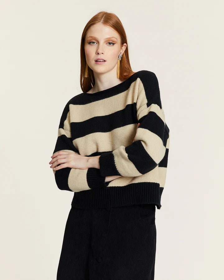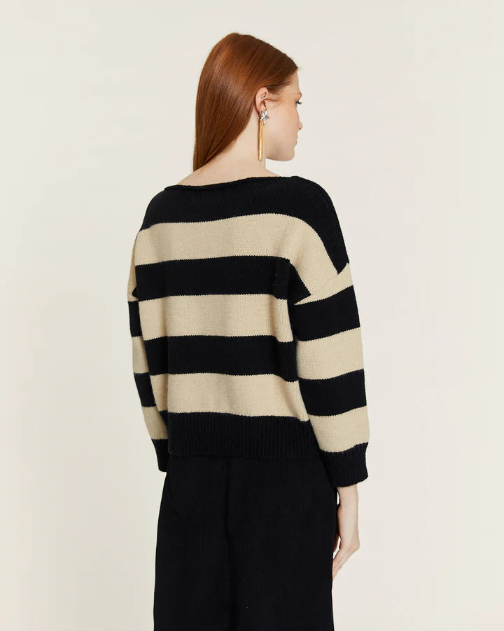 Jersey de estilo atemporal con un diseño de rayas horizontales en tonos negro y crema, confeccionado en un tejido suave y cómodo. Presenta un escote barco que realza la línea de los hombros y aporta un toque femenino y elegante.