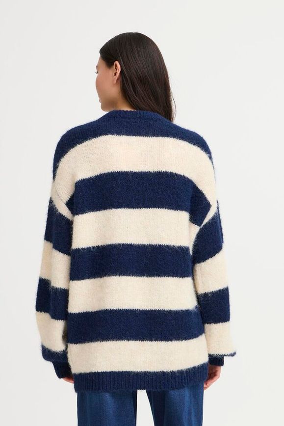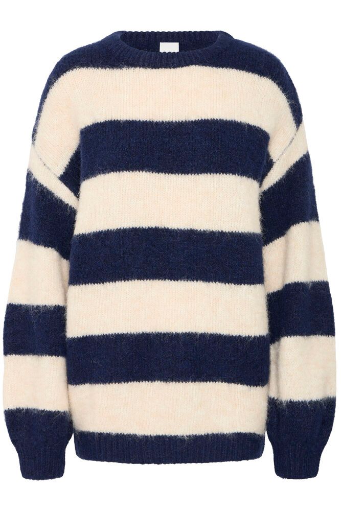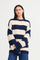 Jersey de punto con rayas marino y blanco, un clásico renovado que no puede faltar en tu armario. Este jersey de punto combina rayas horizontales en marino y blanco, creando un estilo atemporal con un toque marinero que siempre está de moda.
