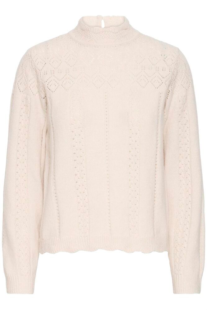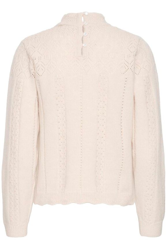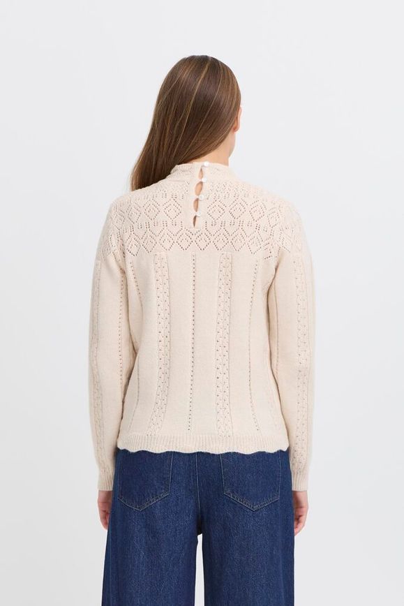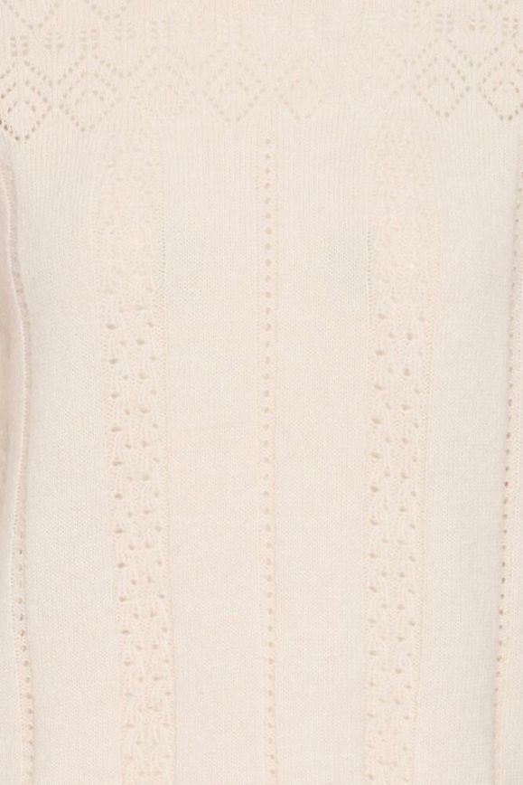 Jersey de punto calado en color crema, diseñado para aportar calidez y un toque delicado a tus looks de temporada. Confeccionado en un tejido suave, destaca por su bonito patrón calado que combina franjas verticales en el cuerpo y mangas, con un detalle geométrico en el canesú que le da un aire muy femenino y romántico.