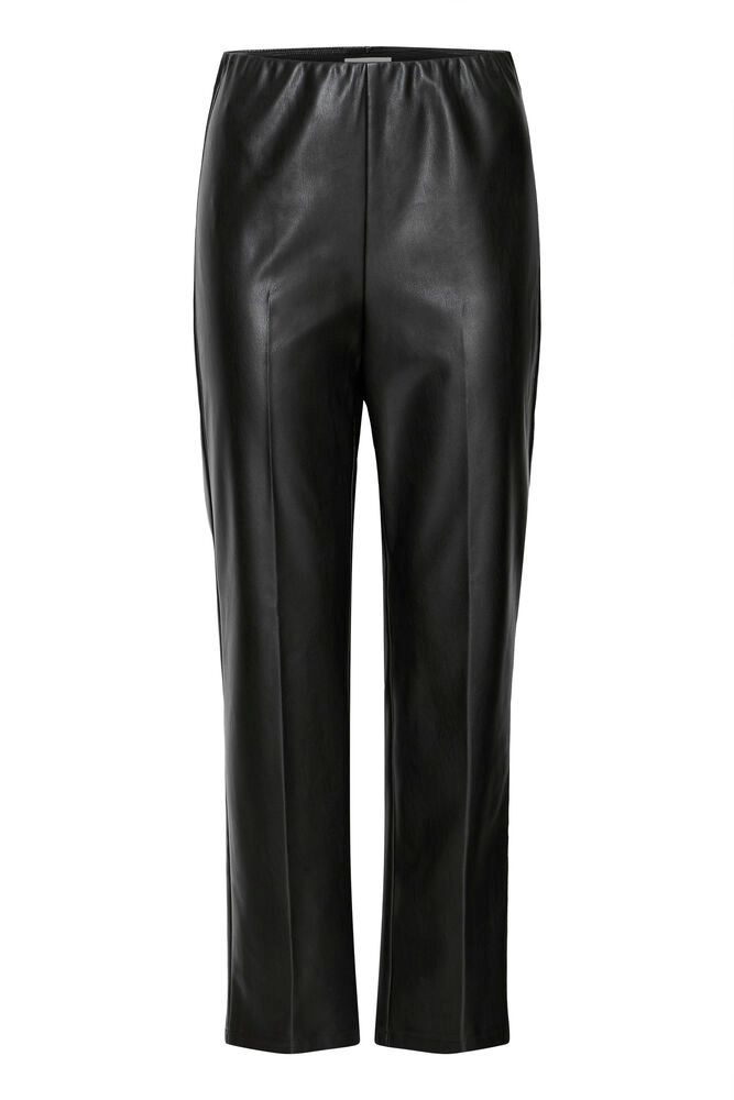 Presenta una pernera recta y ligeramente corta (cropped), que aporta frescura y permite lucir el calzado, ya sea tacones, botines o mocasines. El acabado efecto piel ofrece una apariencia elegante y contemporánea, ideal tanto para conjuntos urbanos como para estilismos de noche.