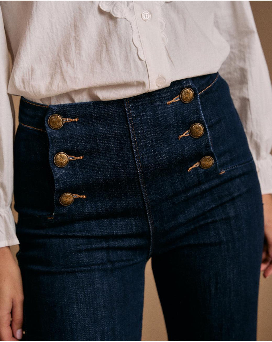 Pantalón de mujer en denim oscuro con talle alto y botones dorados