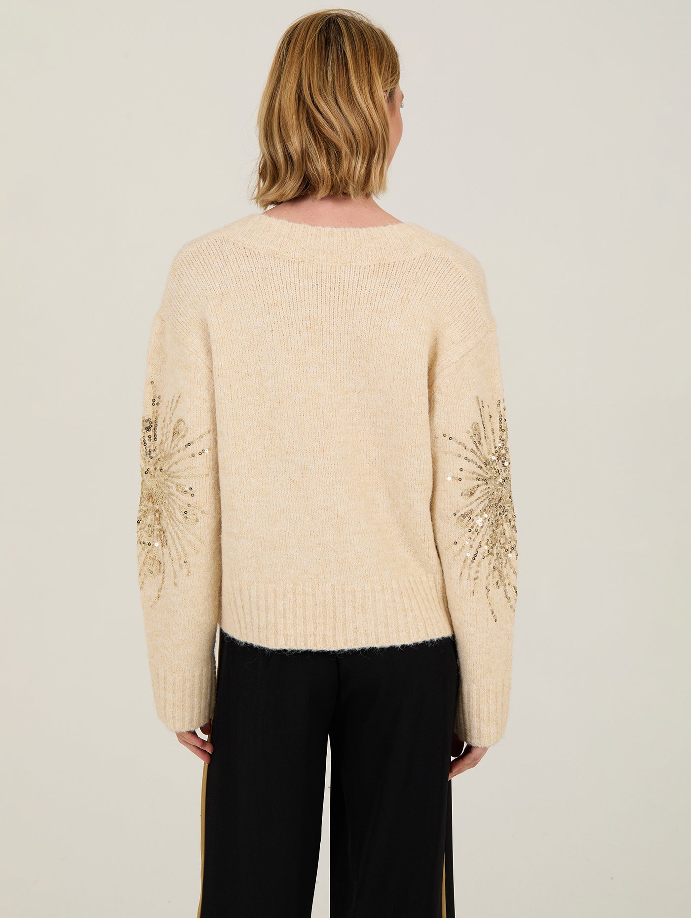 Su diseño clásico con escote en pico realza la silueta y lo convierte en una prenda versátil y favorecedora. Los brazos decorados con un delicado adorno de lentejuelas añaden un detalle sofisticado que ilumina el conjunto de manera sutil.