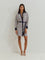 Presenta una abertura delantera con botones dorados, también presentes en los puños, que aportan un toque sofisticado y luminoso. Los detalles de color en contraste en el cuello, los puños y la tapeta añaden un acabado refinado y llamativo, mientras que el cinturón extraíble permite ajustar la silueta y personalizar el look según la ocasión.