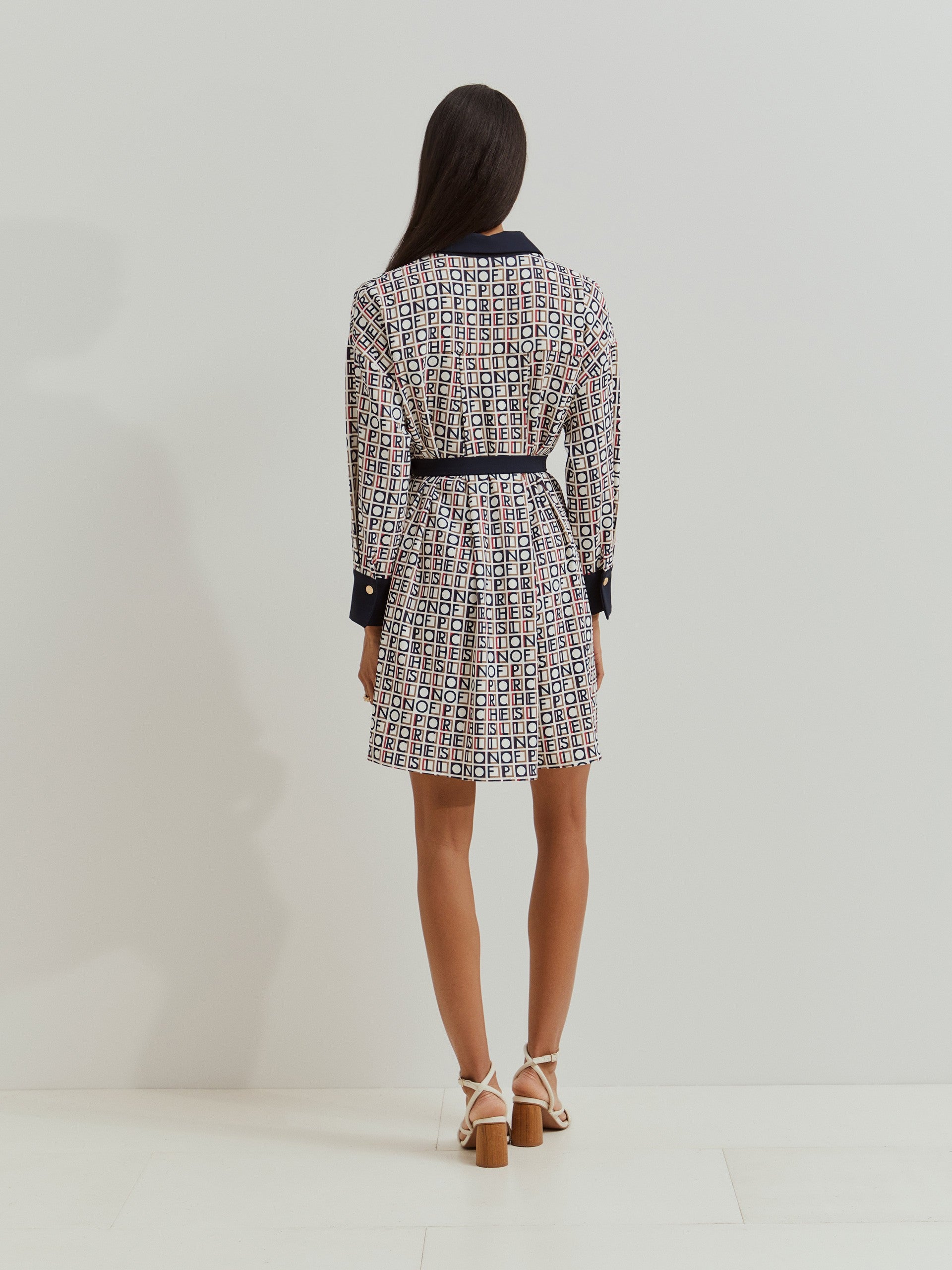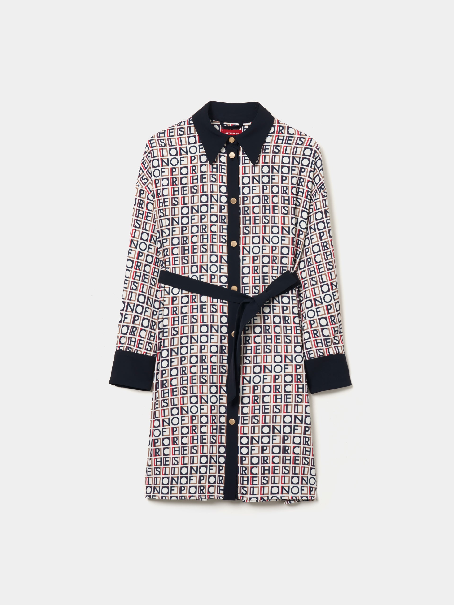 Vestido camisero acampanado, estampado con el icónico logo de Lion of Porches por toda la prenda. Su diseño combina un estilo clásico con detalles modernos que realzan su carácter distintivo.