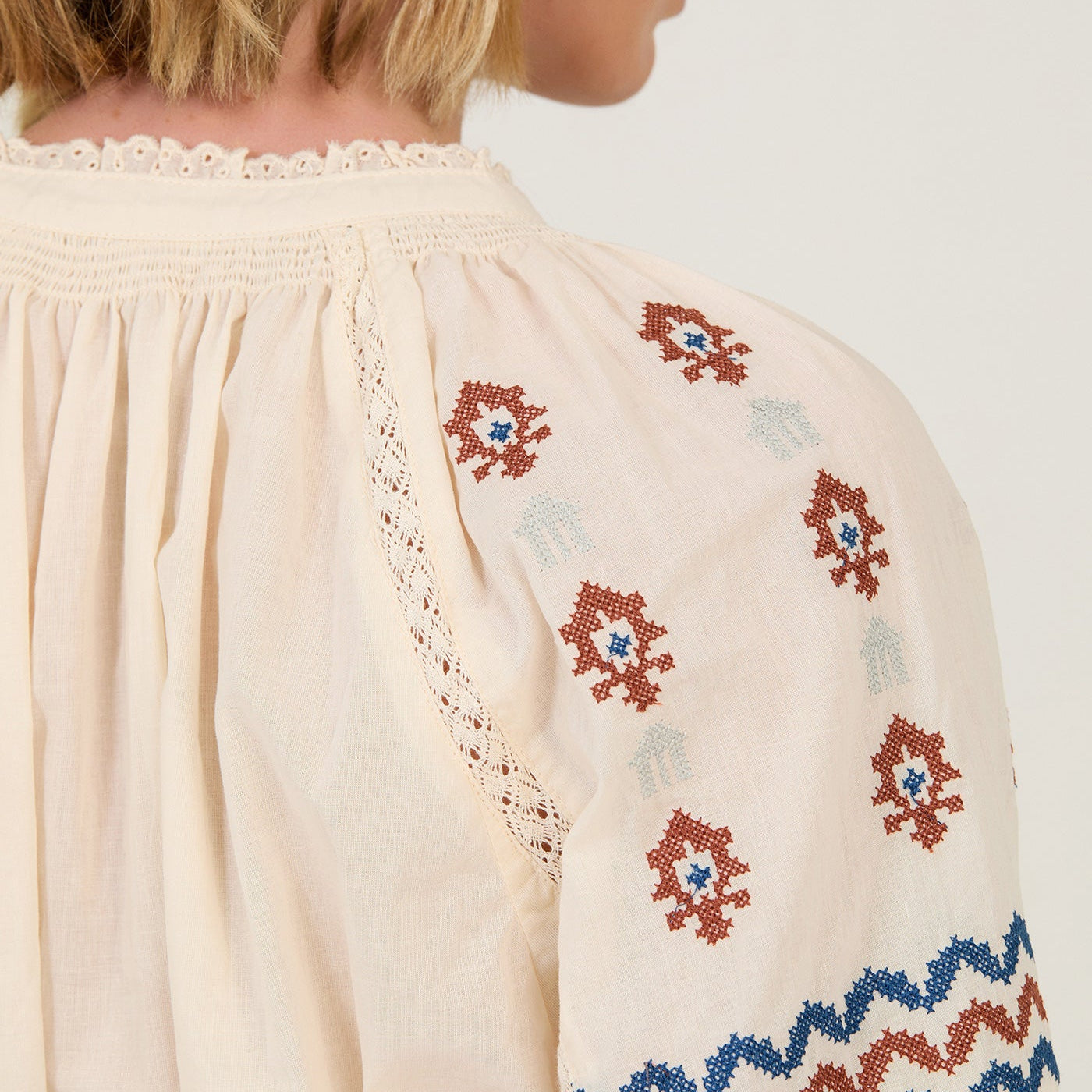 Esta blusa de algodón con cuello de puntilla combina delicadeza y encanto artesanal en un diseño lleno de detalles. Confeccionada en algodón suave y natural, destaca por sus bordados en tonos marrón, azul y verde azulado, que aportan un aire romántico y auténtico.