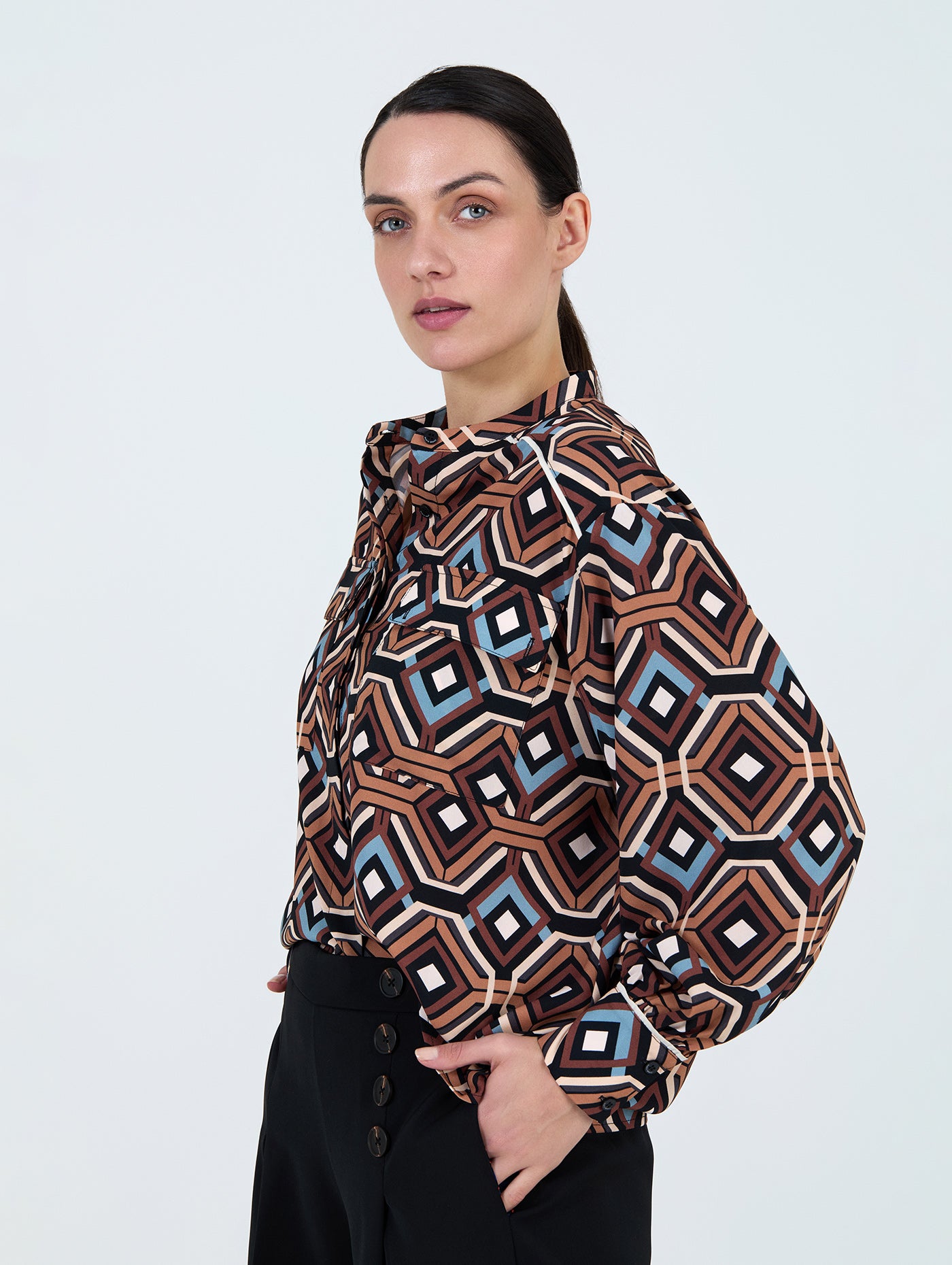 Blusa confeccionada en un ligero tejido con estampado geométrico que aporta un aire moderno y sofisticado. Su diseño incorpora un elegante cuello mao y mangas abullonadas que añaden volumen y un toque distintivo al conjunto.