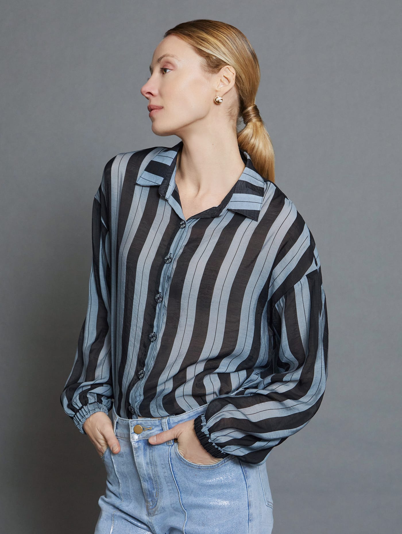 El cuello tipo camisa aporta un aire tradicional y versátil, mientras que las mangas largas de caída natural proporcionan un ajuste relajado. Los puños con elástico aseguran comodidad y un ajuste sin apretar, creando un look desenfadado. El cierre mediante botonadura frontal facilita su uso y permite ajustarla a diferentes estilos.