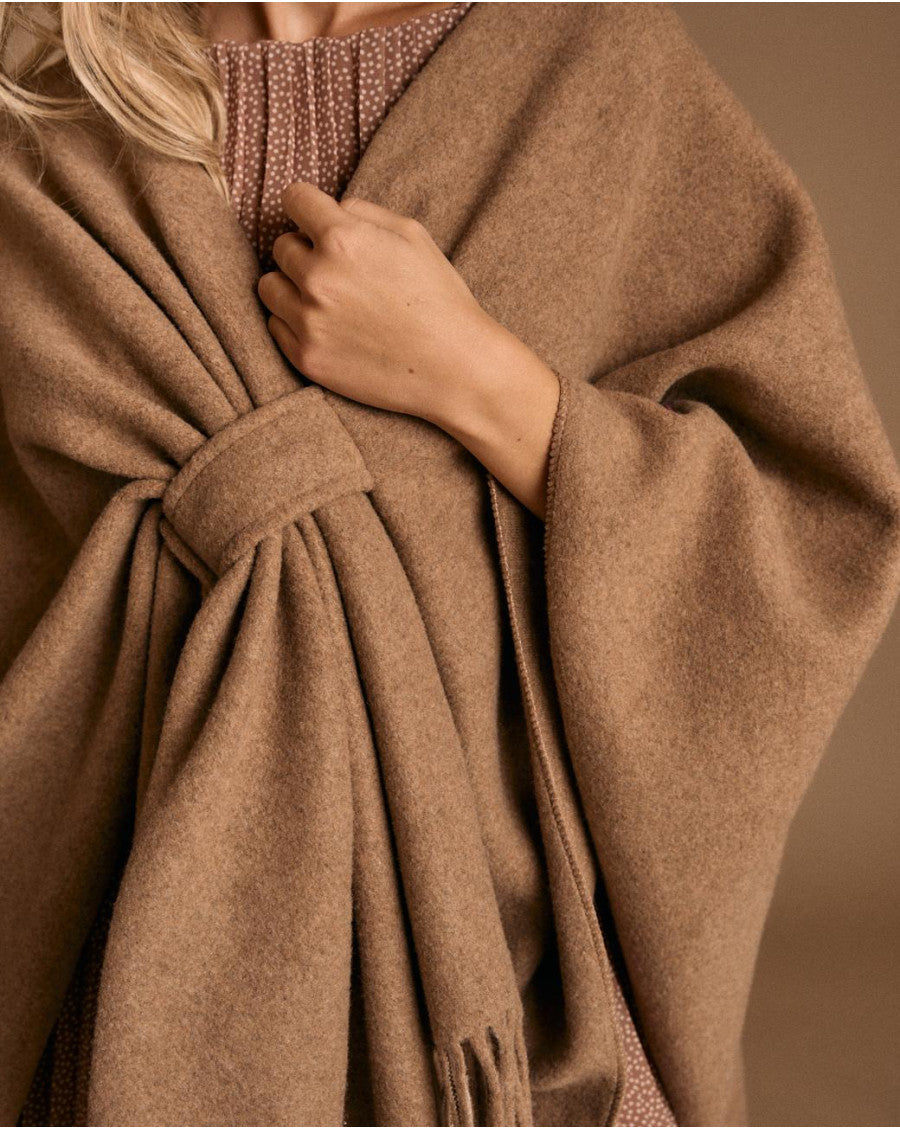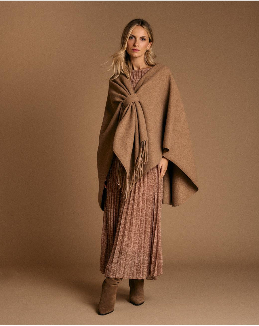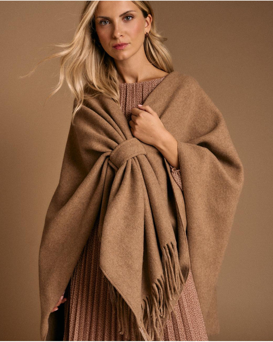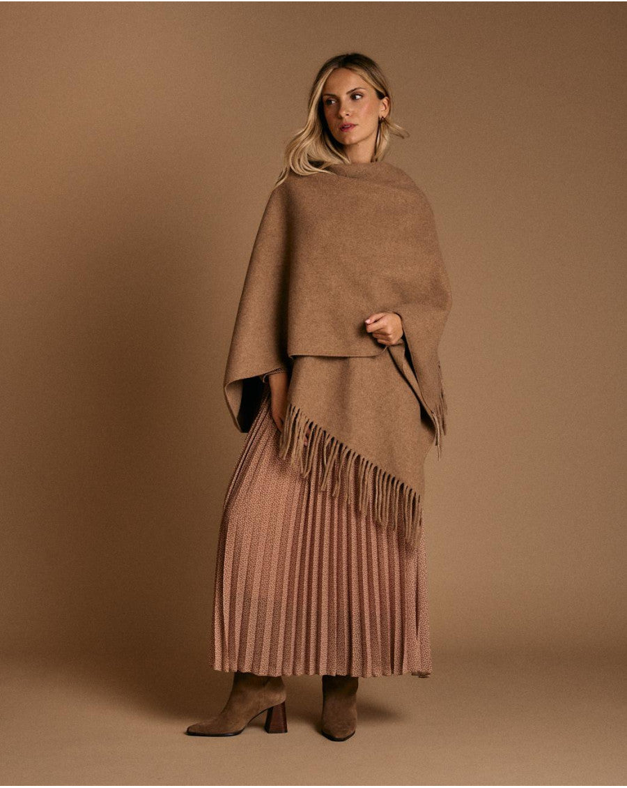 Esta capa en color camel, confeccionada en tejido suave y cálido, destaca por su diseño envolvente que aporta comodidad y elegancia a cualquier look. El acabado de flecos en el bajo añade movimiento y un toque moderno, convirtiéndola en una pieza versátil, perfecta para combinar con outfits de entretiempo o invierno. Ideal para quienes buscan estilo, calidez y sofisticación en una sola prenda.