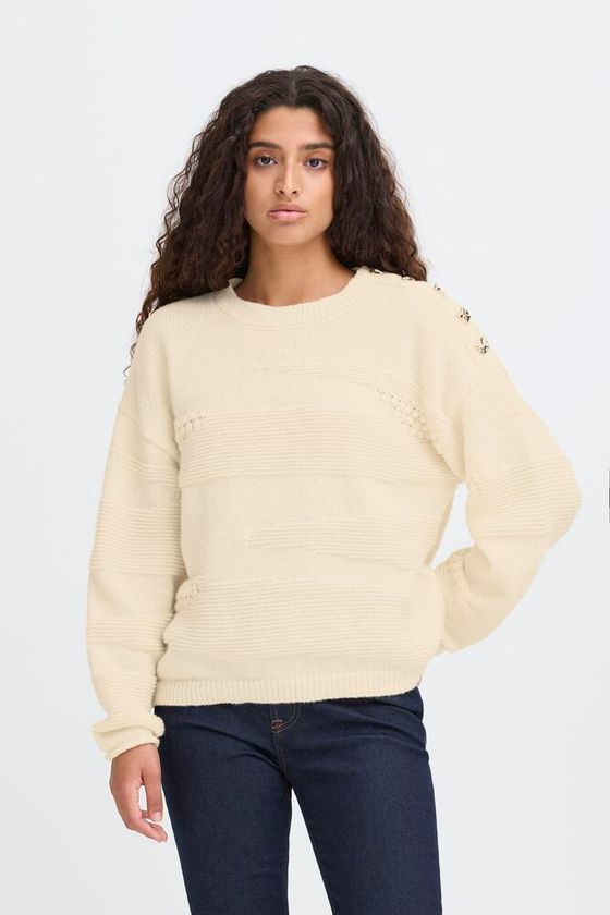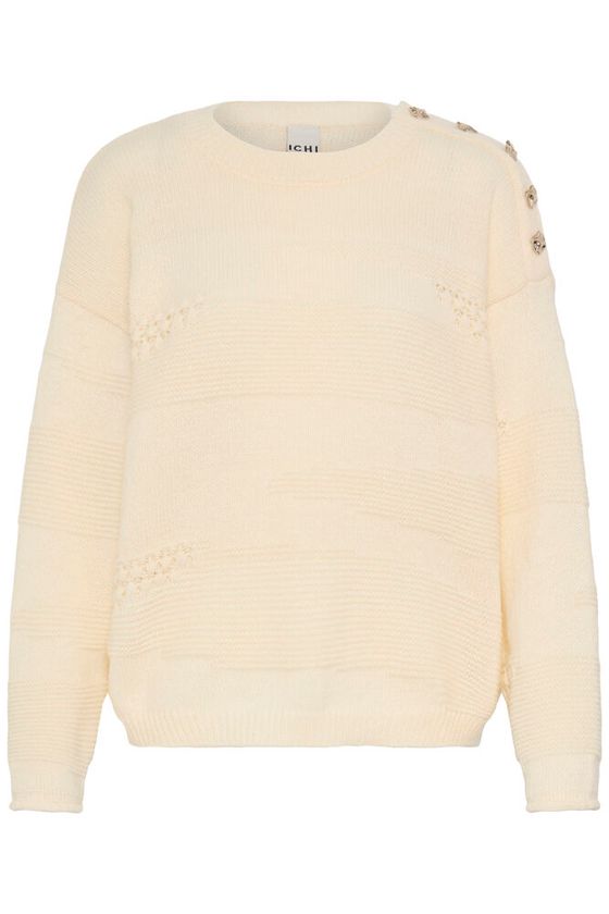 Su diseño destaca por los delicados calados repartidos de forma sutil en el tejido, que aportan un toque femenino y ligero. En los hombros incorpora un detalle distintivo: botones dorados decorativos que elevan la prenda y le añaden un aire sofisticado y actual.