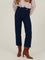 Pantalón Tobillero Denim Botones confeccionado en denim elástico que se adapta a la silueta. Su diseño destaca por el original detalle de dos botones dorados en la cintura, colocados como si fueran parte de un cinturón o cierre decorativo, lo que aporta un toque moderno y sofisticado.