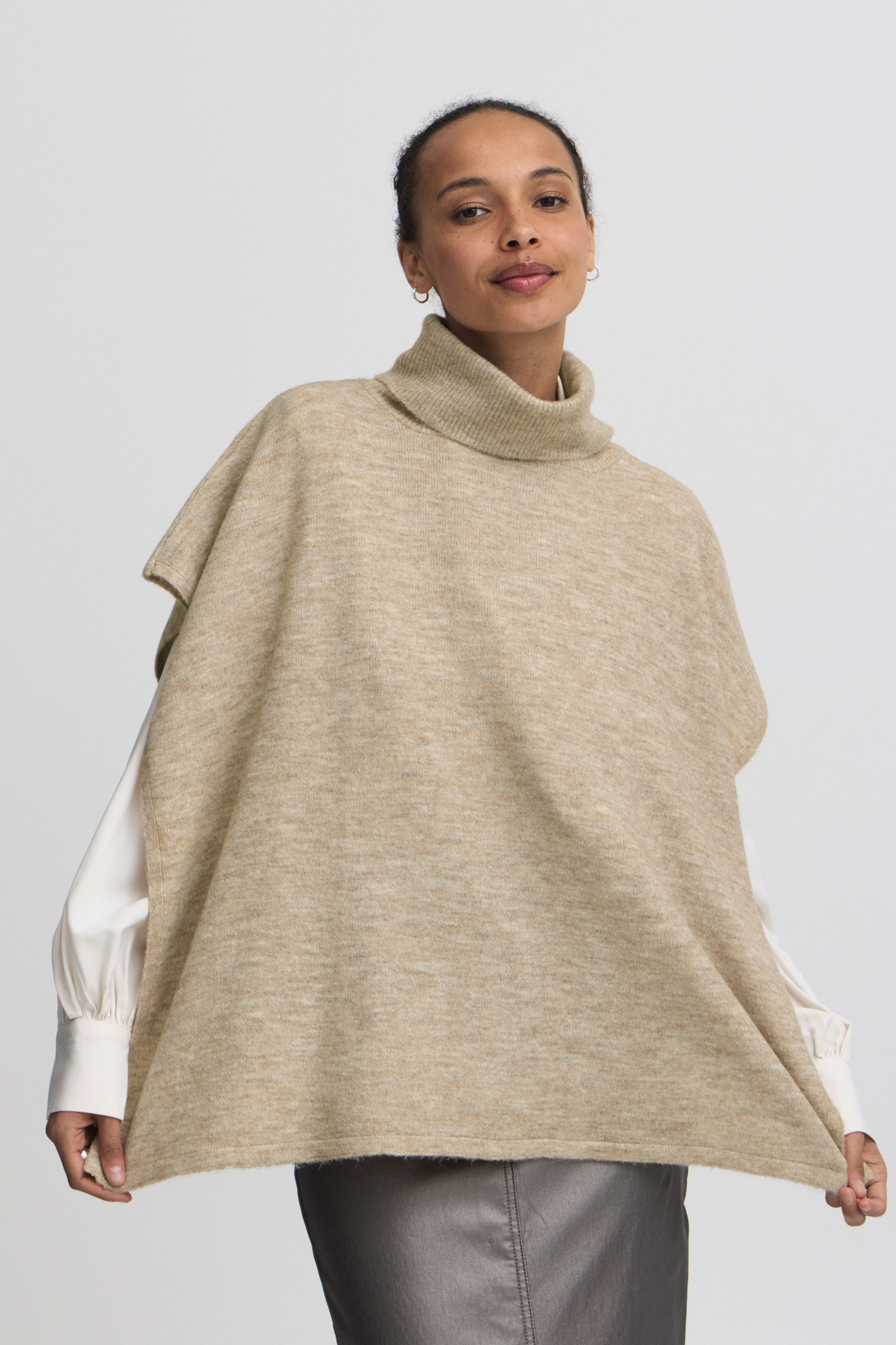 Poncho Baviksi Camel corte amplio que favorece diferentes tipos de cuerpo. Al no ceñirse al cuerpo, garantiza una gran libertad de movimiento , lo que lo hace perfecto tanto para el día a día como para ocasiones más especiales. Este corte amplio le da un aire contemporáneo y elegante a la prenda, manteniendo una estética minimalista que resulta atemporal.